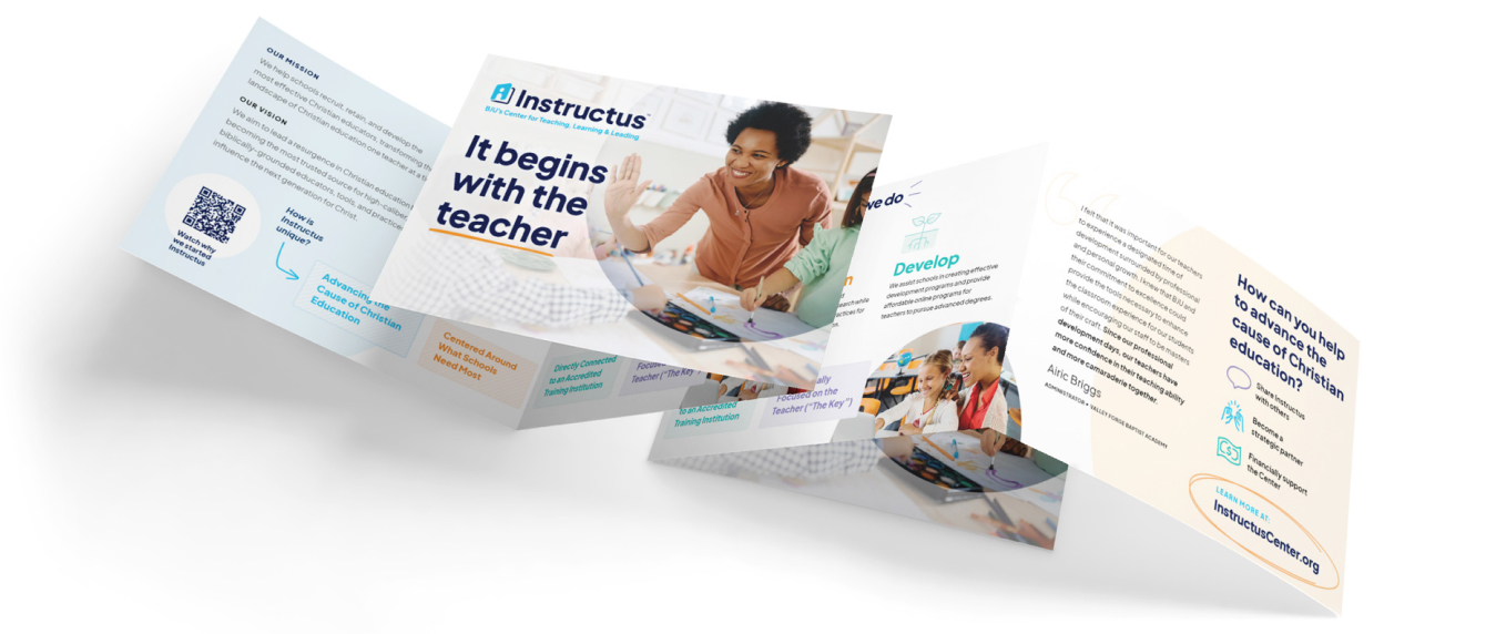 Before creating awareness, the center had to have a great name. To name the center, we worked through its vision and mission and then created a series of options that conveyed that mission. The name "Instructus" beat out all of the other options. "Instructus" has Latin roots that mean "to teach and develop," a fitting name to match its vision.